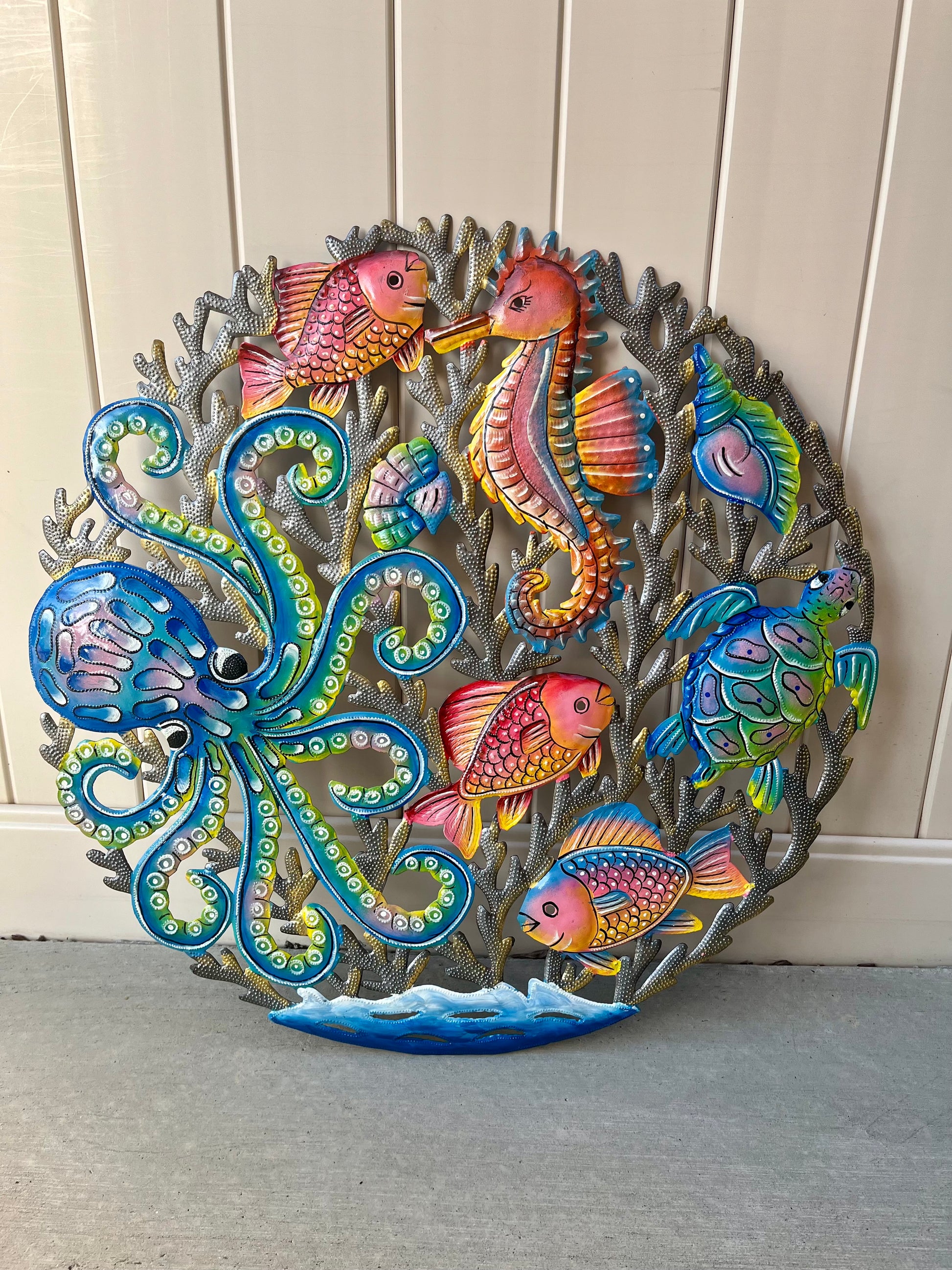 What is Metal Art?Haitian Metal Art is a unique and beautiful art form that transforms 55-gallon steel oil drums into incredible pieces of art. It is imbedded in Haitian culture and was pioneered by Georges Liautaud in the 1950's when he began making crosses to honor the dead at cemeteries. This tradition has been passed down through generations and most Artisans can be found working in the village of Croix-des-Bouquets.How it's Made!The process of making each piece and is extremely labor intensive.First the top and bottom of the 55-gallon oil drum is cut, placed inside the drum, and set on fire to burn excess oil and paint. The cylinder is then cut down the center, laid flat, and pounded out into a thin sheet that is around 3'x6'.Next, the artist uses chalk and a stencil to plan out the design and uses a hammer and chisel to cut out the shape. The artist uses tools that look like railroad spikes to hammer out different patterns and create texture.Final step is polishing the metal with a wire brush and applying a clear varnish to give the piece a glossy finished look.