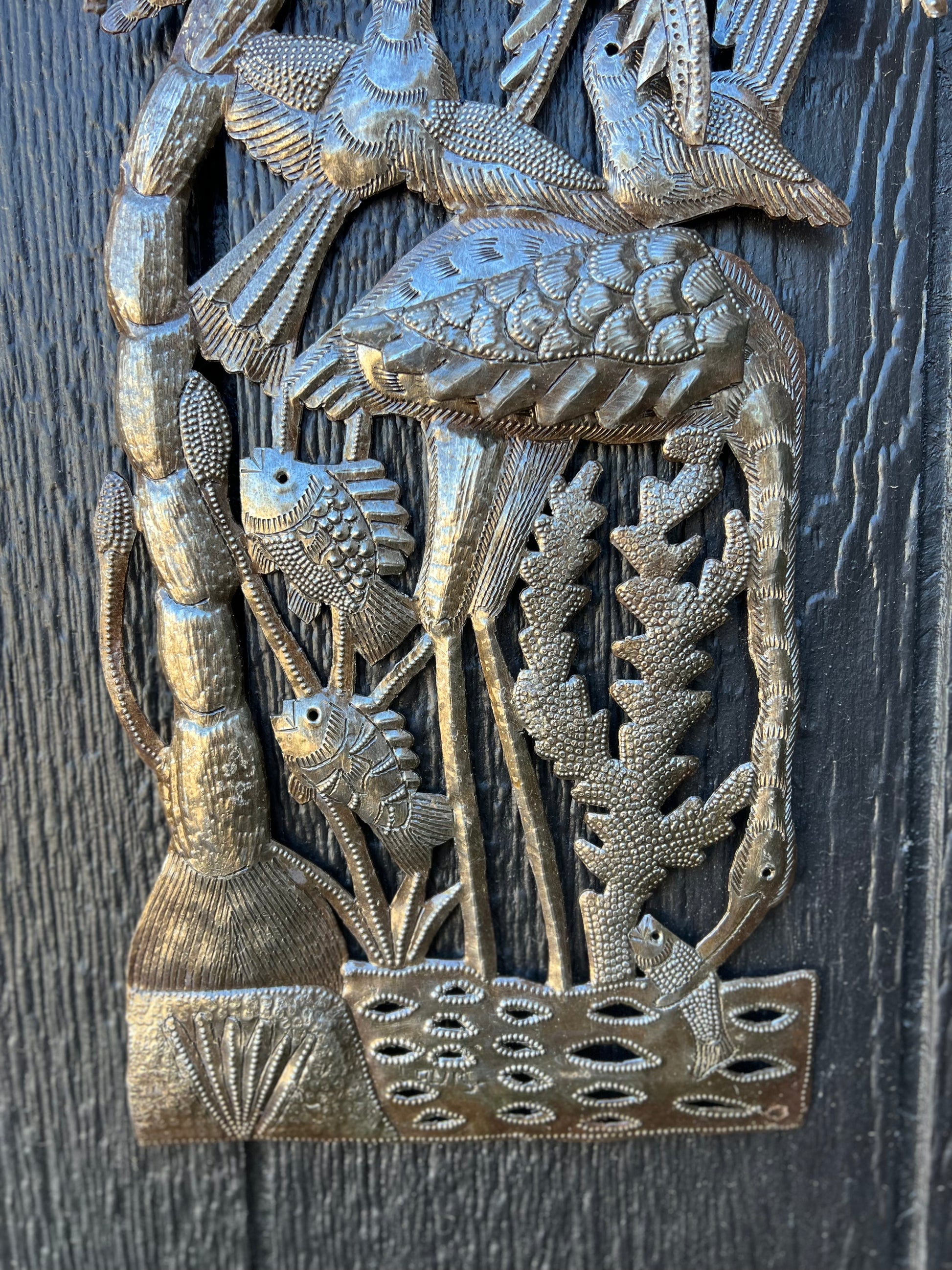 What is Metal Art?Haitian Metal Art is a unique and beautiful art form that transforms 55-gallon steel oil drums into incredible pieces of art. It is imbedded in Haitian culture and was pioneered by Georges Liautaud in the 1950's when he began making crosses to honor the dead at cemeteries. This tradition has been passed down through generations and most Artisans can be found working in the village of Croix-des-Bouquets.How it's Made!The process of making each piece and is extremely labor intensive.First the top and bottom of the 55-gallon oil drum is cut, placed inside the drum, and set on fire to burn excess oil and paint. The cylinder is then cut down the center, laid flat, and pounded out into a thin sheet that is around 3'x6'.Next, the artist uses chalk and a stencil to plan out the design and uses a hammer and chisel to cut out the shape. The artist uses tools that look like railroad spikes to hammer out different patterns and create texture.Final step is polishing the metal with a wire brush and applying a clear varnish to give the piece a glossy finished look.