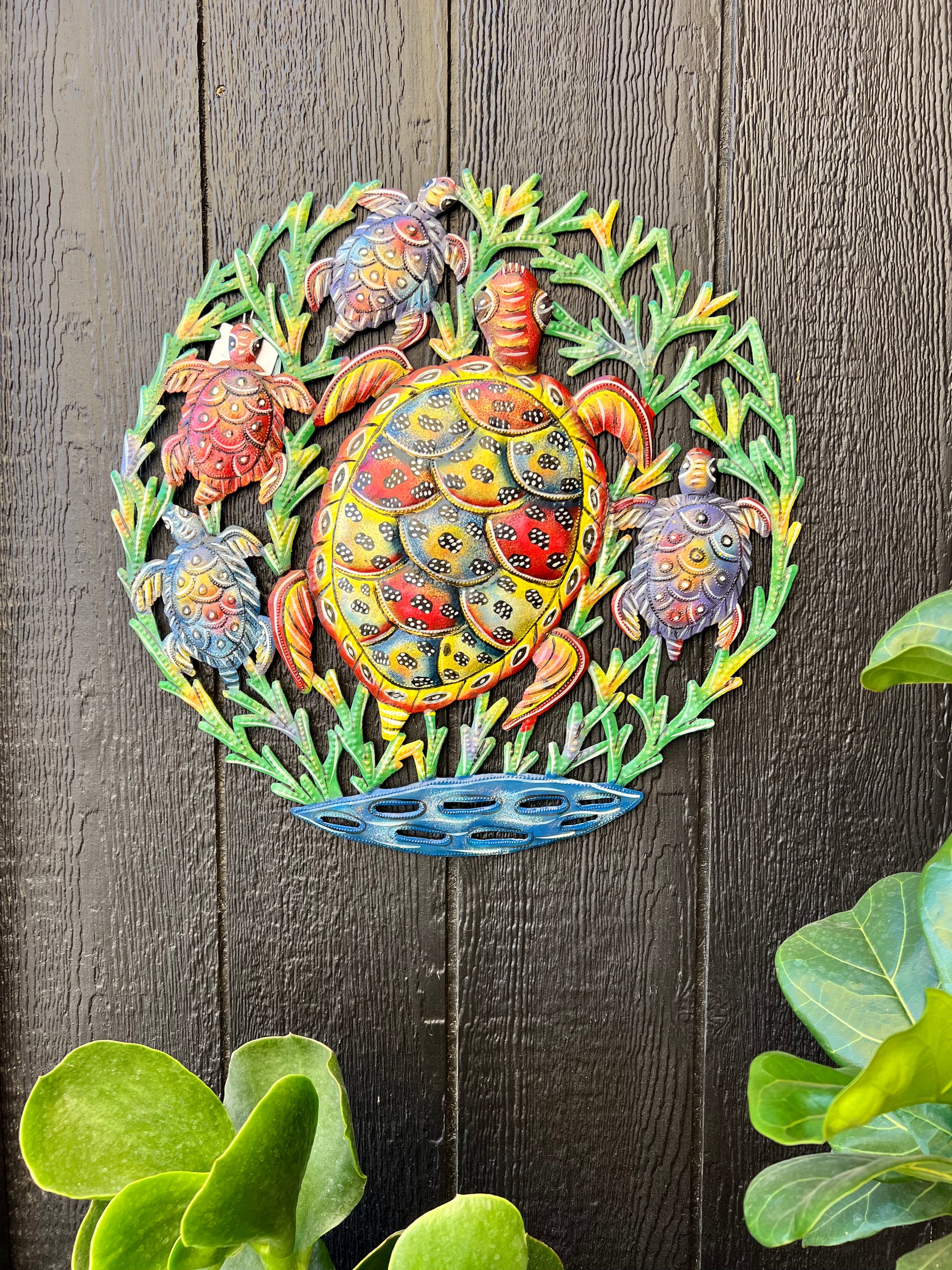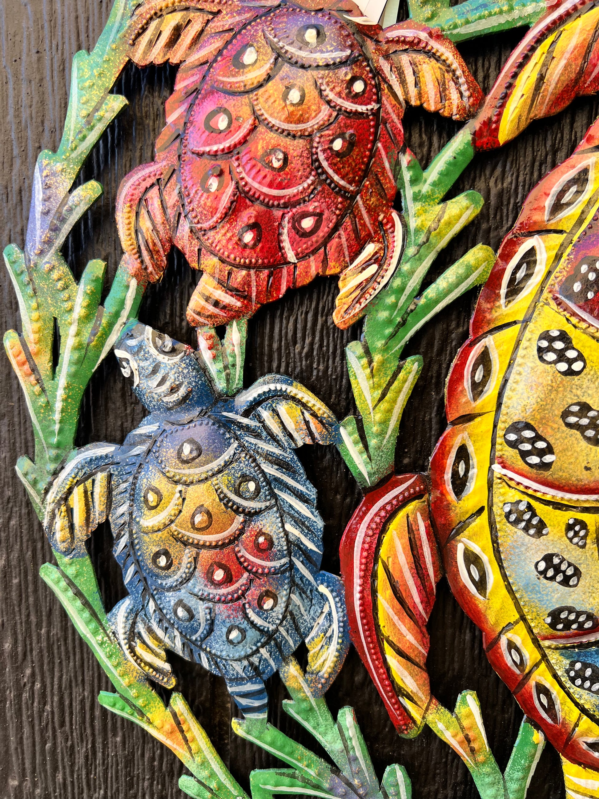 What is Metal Art?Haitian Metal Art is a unique and beautiful art form that transforms 55-gallon steel oil drums into incredible pieces of art. It is imbedded in Haitian culture and was pioneered by Georges Liautaud in the 1950's when he began making crosses to honor the dead at cemeteries. This tradition has been passed down through generations and most Artisans can be found working in the village of Croix-des-Bouquets.How it's Made!The process of making each piece and is extremely labor intensive.First the top and bottom of the 55-gallon oil drum is cut, placed inside the drum, and set on fire to burn excess oil and paint. The cylinder is then cut down the center, laid flat, and pounded out into a thin sheet that is around 3'x6'.Next, the artist uses chalk and a stencil to plan out the design and uses a hammer and chisel to cut out the shape. The artist uses tools that look like railroad spikes to hammer out different patterns and create texture.Final step is polishing the metal with a wire brush and applying a clear varnish to give the piece a glossy finished look.